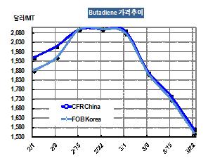 부타디엔 가격은 3월22일 FOB Korea 톤당 1550달러로 175달러 폭락했다. 아시아 부타디엔 가격은 3월1일 FOB Korea 톤당 2080달러에서 3월8일 1865달러, 3월15일 1725달러로 떨어진데 이어 3월22일 1550달러로 하락함으로써 3주 동안 무려 315달러 폭락했다. 표, 그래프: < Butadiene 가격추이 > <화학저널 2013/03/25> |
