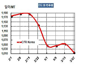 MEG 가격은 3월22일 CFR China 톤당 1015달러로 38달러 하락했다.