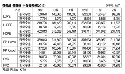 표, 그래프: < 중국의 폴리머 수출입동향(2013) > <화학저널 2013/03/26> |
