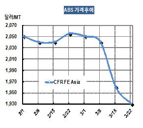 ABS 가격은 3월20일 CFR China 톤당 1930달러로 30달러 폭락했다.