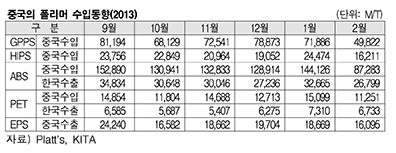 표, 그래프: < 중국의 폴리머 수입동향(2013) > <화학저널 2013/03/28> |