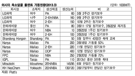 표, 그래프: < 아시아 옥소알콜 플랜트 가동현황(2013.3) > <화학저널 2013/04/01> |
