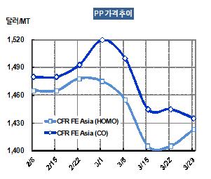 PP 가격은 3월27일 CFR FE Asia 톤당 1420달러로 15달러 상승했다.