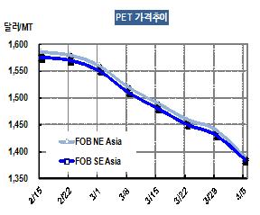 PET 가격은 4월3일 FOB Korea 톤당 1389달러로 51달러 급락했다.