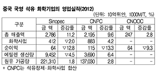 2012년 중국 3대 국영 석유‧화학기업들은 매출액이 증가했음에도 순이익은 감소한 것으로 나타났다.