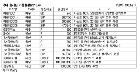 국내 올레핀(Olefin) 시장은 부타디엔(Butadiene)의 정기보수에도 불구하고 별 영향을 미치지 못할 것으로 예상된다. 한편, SK종합화학은 울산 소재 프로필렌 15만톤 크래커를 5월20일부터 6월8일까지, 프로필렌 35만톤 크래커는 7월21일부터 9월21일까지 정기보수할 계획이다. <허웅 기자> 표, 그래프: < 국내 올레핀 가동현황(2013.4) > <화학저널 2013/04/12> |