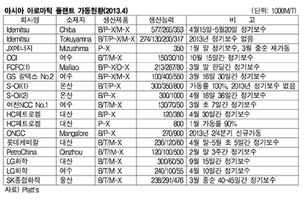 표, 그래프: < 아시아 아로마틱 플랜트 가동현황(2013.4) > <화학저널 2013/04/15> |
