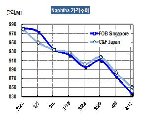 나프타 가격은 4월12일 CFR Japan 톤당 851달러로 32달러 급락했다.