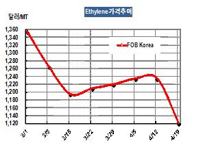 에틸렌 가격은 4월19일 FOB Korea 톤당 1120달러로 115달러 폭락했다.