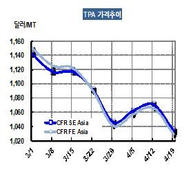 PTA 가격은 4월19일 CFR China 톤당 1029달러로 37달러 급락했다. 중국의 폴리에스터(Polyester) 판매/생산 비율이 40-50%로 하락해 생산량이 수요량보다 2배 이상 많은 것으로 알려지고 있다. 표, 그래프: < TPA 가격추이 > <화학저널 2013/04/25> |