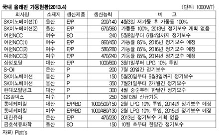 표, 그래프: < 국내 올레핀 가동현황(2013.4) > <화학저널 2013/04/26> |