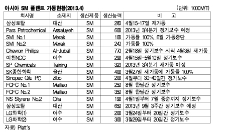 표, 그래프: < 아시아 SM 플랜트 가동현황(2013.4) > <화학저널 2013/04/30> |