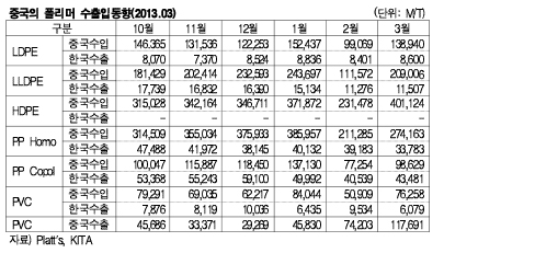 표, 그래프: <중국의 폴리머 수출입동향(2013.03)> <화학저널 2013/04/30> |