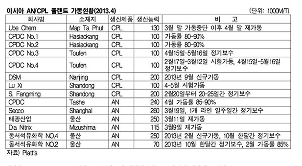 표, 그래프: < 아시아 AN/CPL 플랜트 가동현황(2013.4) > <화학저널 2013/05/07> |