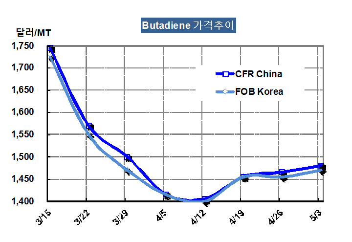 부타디엔 가격은 5월3일 FOB Korea 톤당 1470달러로 15달러 상승했다.