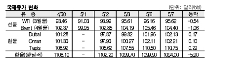 5월7일 국제유가는 세계 석유 수급 완화, 사우디 생산 증가, 미국의 원유 재고 증가 전망으로 하락했다.