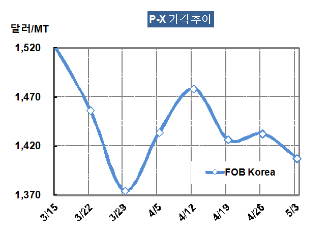 P-X 가격은 5월3일 FOB Korea 톤당 1408달러로 25달러 하락했다.