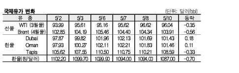 5월10일 국제유가는 미국의 달러화 강세, 석유 수급 완화 등의 영향으로 하락했다.