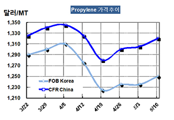 프로필렌 가격은 5월10일 FOB Korea 톤당 1250달러로 15달러 상승했다.
