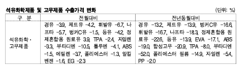 표, 그래프: <석유화학제품 및 고무제품 수출가격 변화> <화학저널 2013/05/21> |