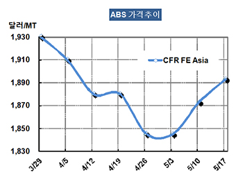 ABS 가격은 5월15일 CFR China 톤당 1893달러로 20달러 상승했다.