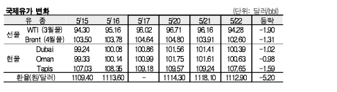 5월22일 100.39달러로 1.02달러 하락 … 브렌트유는 102.60달러