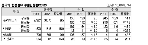 표, 그래프: <중국의 합성섬유 수출입동향(2012)> <화학저널 2013/05/23> |
