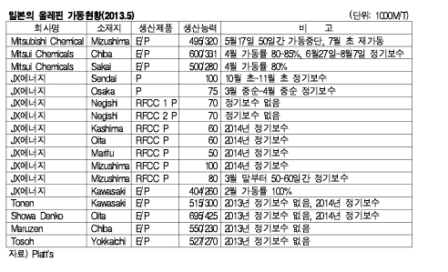 일본 올레핀(Olefin) 시장은 상반기 정기보수가 마무리되면서 공급과잉이 지속되고 있다. 반면, RFCC(Residue Fluid Catalytic Cracker)는 2013년 정기보수 없이 가동할 예정이고, Maruzen도 Chiba 소재 에틸렌 69만5000톤 및 프로필렌 42만5000톤 크래커를 2014년까지 정기보수 없이 가동할 계획이다. 표, 그래프: <일본의 올레핀 가동현황(2013.5) > <화학저널 2013/05/24> |