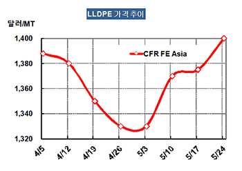 LLDPE 가격은 5월22일 CFR FE Asia 톤당 1400달러로 25달러 급등했다. LLDPE는 에틸렌(Ethylene) 가격이 CFR NE Asia 톤당 1230달러로 35달러 상승함으로써 중합코스트 톤당 170달러를 고려하면 손익분기점이 1400달러로 분석되고 있다. 표, 그래프: < LLDPE 가격추이 > <화학저널 2013/05/27> |