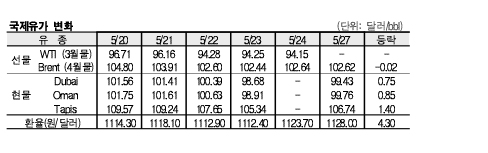 5월27일 국제유가는 중국의 경제성장 둔화 가능성, OPEC(석유수출국기구)의 생산쿼터 유지 등으로 하락했다.