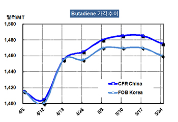 부타디엔(Butadiene) 가격은 5월23일 FOB Korea 톤당 1460달러로 10달러 하락했다. 원료 나프타(Naphtha) 가격이 5월22일 CFR Japan 톤당 848달러로 12달러 떨어졌기 때문이다. 표, 그래프: < Butadiene 가격추이 > <화학저널 2013/05/29> |