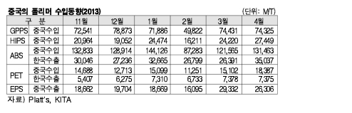 표, 그래프: < 중국의 폴리머 수입동향(2013) > <화학저널 2013/05/29> |