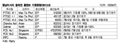 표, 그래프: < 동남아시아 올레핀 플랜트 가동현황(2013.5) > <화학저널 2013/05/29> |