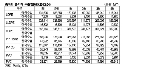 표, 그래프: <중국의 폴리머 수출입동향(2013.04) > <화학저널 2013/05/30> |