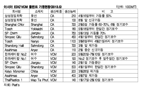 표, 그래프: <아시아 EDC/VCM 플랜트 가동현황(2013.5)> <화학저널 2013/05/31> |