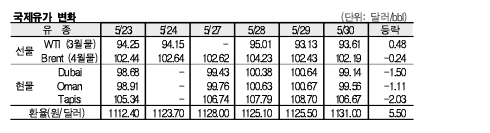5월30일 99.14달러로 1.50달러 급락 … 브렌트유는 102.19달러 형성