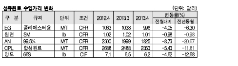 AN(Acrylonitrile) 수입가격이 큰 폭으로 떨어졌다. 표, 그래프: <섬유원료 수입가격 변화> <화학저널 2013/06/03> |