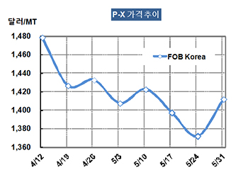P-X 가격은 5월31일 FOB Korea 톤당 1412달러로 40달러 급등했다.