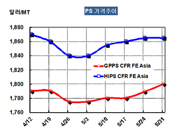 GPPS 가격은 5월29일 CFR China 톤당 1800달러로 11달러 상승했다.