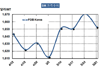 SM 가격은 5월31일 FOB Korea 톤당 1653달러로 18달러 하락했다.