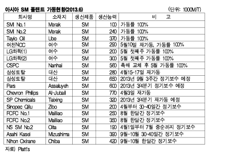 표, 그래프: <아시아 SM 플랜트 가동현황(2013.6) > <화학저널 2013/06/05> |
