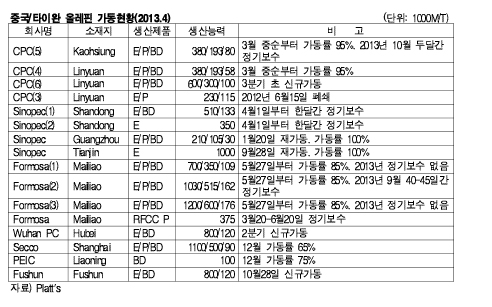 표, 그래프: <중국/타이완 올레핀 가동현황(2013.4)> <화학저널 2013/06/07> |