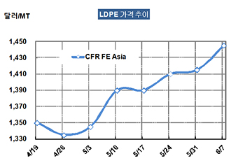LDPE 가격은 6월5일 CFR FE Asia 톤당 1445달러로 30달러 폭등했다.