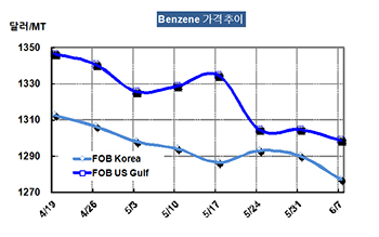 벤젠 가격은 6월7일 FOB Korea 톤당 1277달러로 13달러 하락했다.
