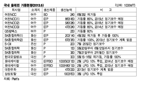 표, 그래프: <국내 올레핀 가동현황(2013.6)> <화학저널 2013/06/12> |