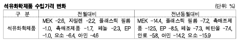 특히, MEK가 전년동월대비 14.4% 급락해 4월 10.7% 떨어진데 이어 급락세를 이어가고 있으며, 요소는 15.9% 떨어져 가장 큰 하락폭을 기록했다.