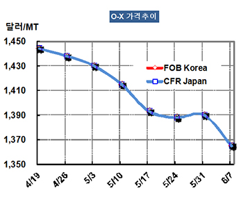 O-X 가격은 6월7일 FOB Korea 톤당 1365달러로 25달러 하락했다.
