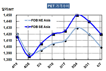 PET 가격은 6월5일 FOB NE Asia 톤당 1400달러로 20달러 하락했다.