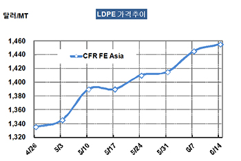 LDPE 가격은 6월12일 CFR FE Asia 톤당 1455달러로 10달러 상승했다.