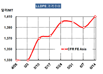 LLDPE 가격은 6월12일 CFR FE Asia 톤당 1410달러로 20달러 급등했다.